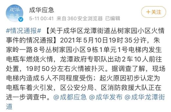5月10日19时,成都一小区电瓶车在电梯内发生自燃,导致电梯里的四名大人和一名婴儿被不同程度烧伤。