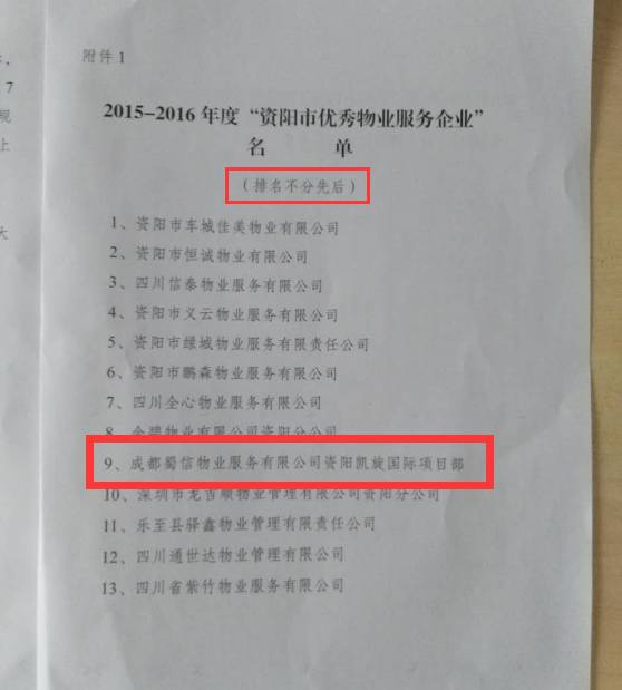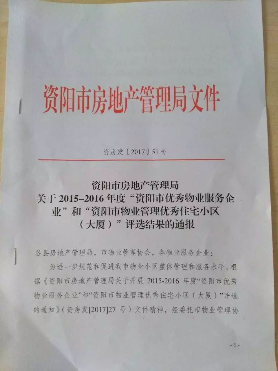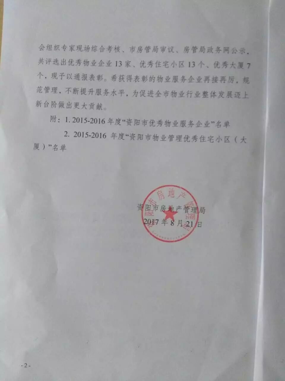 荣膺“2015-2016年度资阳市优秀物业服务企业”